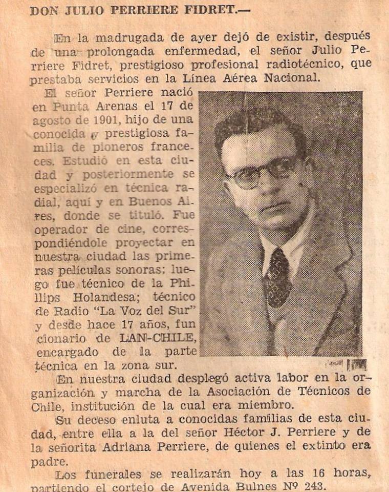 Julio Luciano Perrière Fidret (*22 de Agosto de 1901 - †09 Mayo de 1963), Nacido en Punta Arenas (Magallanes), Chile; realizando su educación Primaria y Secundaria en la ciudad que le vio venir al mundo, para luego realizar continuidad de Estudios Técnicos en Buenos Aires, Argentina donde se Título. Fue un Profesional del rubro Técnico en radiocomunicaciones, desempeñándose como funcionario de la Línea Aérea Nacional.