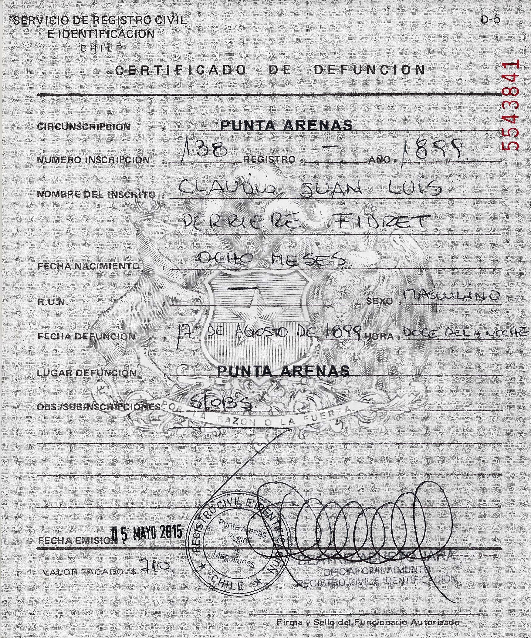 - Fallecido el 18 de Agosto de 1899 - A la edad de 8 meses en Punta Arenas - Magallanes - Chile