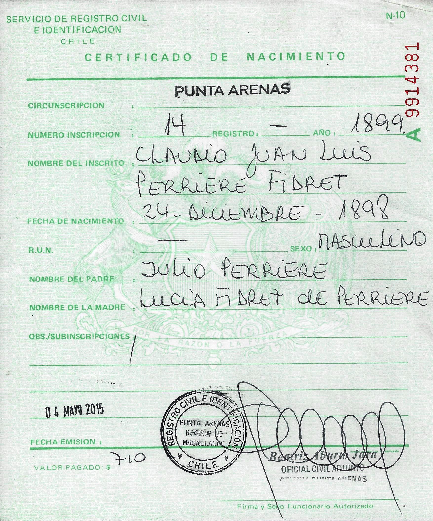 - Nacido el 24 de Diciembre 1898 - Punta Arenas - Magallanes - Chile