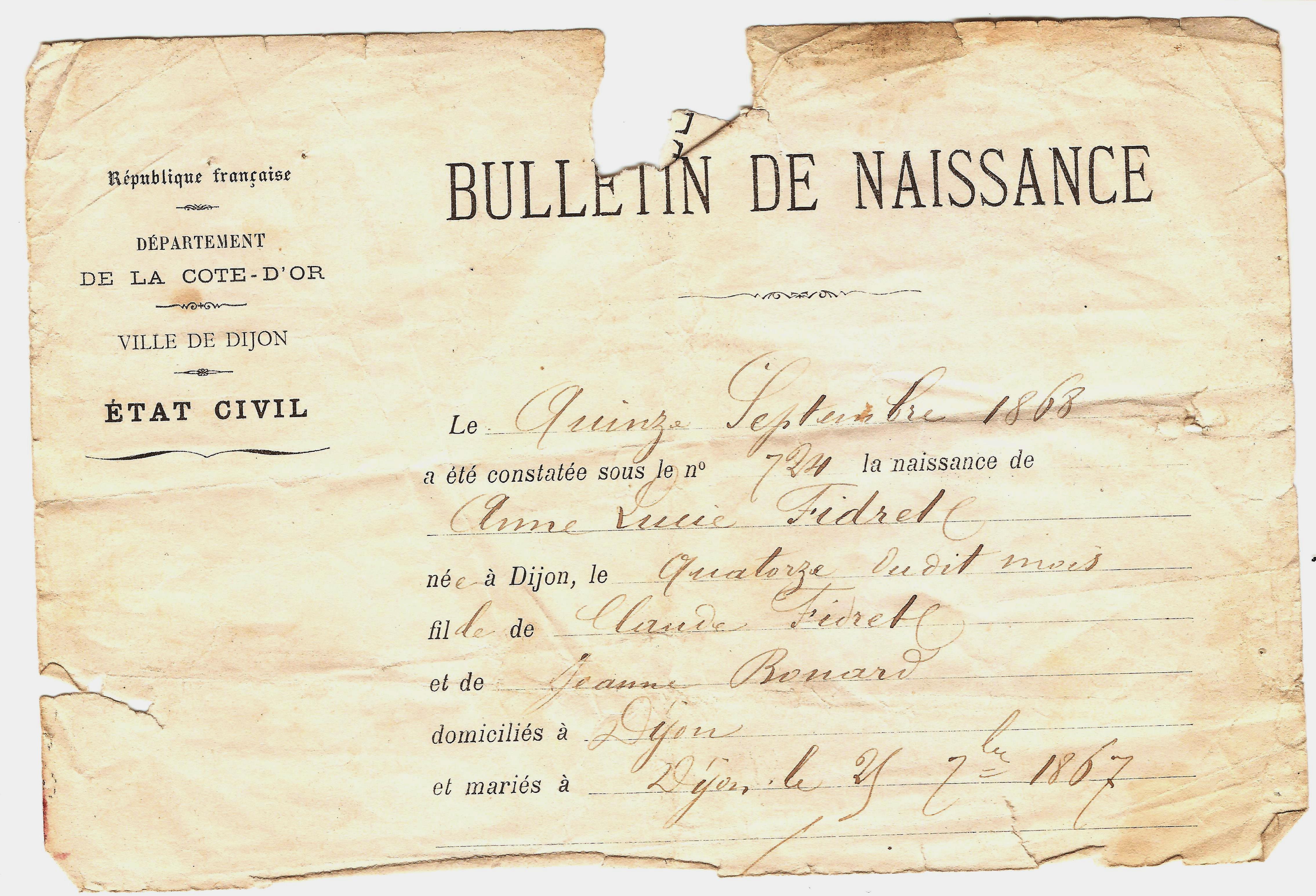 1868-Sept-14, Anne Lucie FIDRET nacida en Dijon - Francia